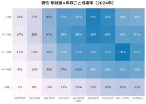 成婚白書2024には、男性の年齢層と年収層ごとの成婚率が詳細に示されています。